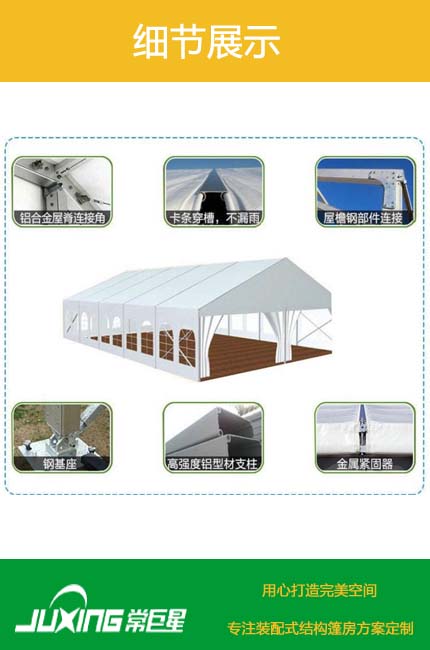常巨星篷房适用于:室外临时展厅,新闻发布会,巡回展,时装秀,接待问讯处,贵宾休息厅,餐饮区、产品促销、主题研讨会、奠基仪式、户外活动、公司庆典、短期仓库、婚礼等。我们关注篷房的每一个细节,致力于打造一个舒适户外活动空间。现有篷房主体框架为中空铝合金结构,连接部位为采用国家焊接钢结构,可调节式基座可弥补场地的不平,篷房采用PVC篷布,该篷布具有不拉伸的良好性能,不透光,采用高频焊接技术,篷房抗风能力达到80-100公里/小时。具有体积小,储存方便,拆装灵活快捷易运输等特点,单位组合式结构,可根据场地的大小自由增加,对搭建场地无特殊要求,一般场地如草地、大理石地、沥青地面、水泥地均可。篷房内无支柱,场地空间得到利用。